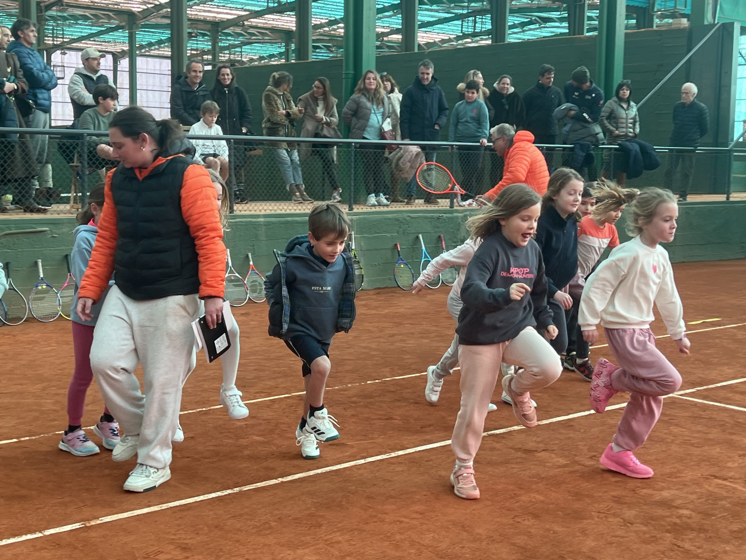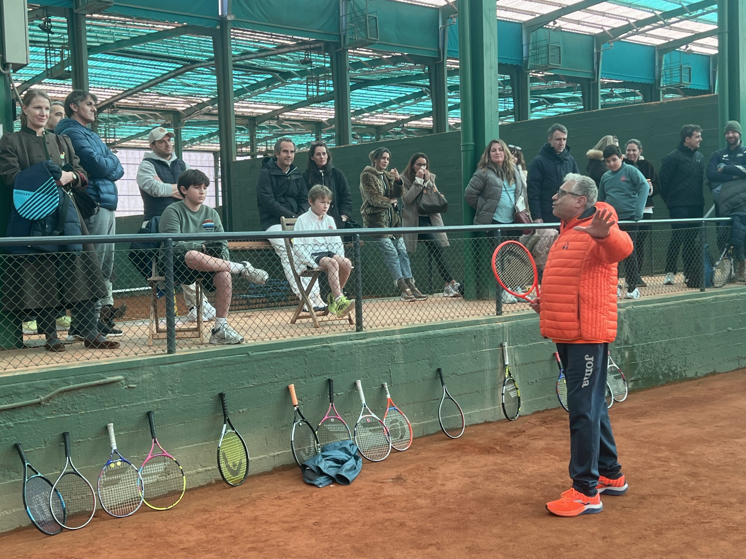 la mitad de la jornada nos hemos reunido todos para tratar de aclarar las pocas dudas o situaciones dignas de mención que se han dado durante la competición, como mantener siempre la raqueta en la mano y no dejarla colgar, tratar de volver al centro de la pista tras cada golpe, contar en voz alta, etc. Para la escuela son muy importantes estas reuniones para comentar las peculiaridades de la competición, en un momento, a la mitad de la jornada, donde los jugadores aún tienen tiempo de poner en práctica las indicaciones de los técnicos.