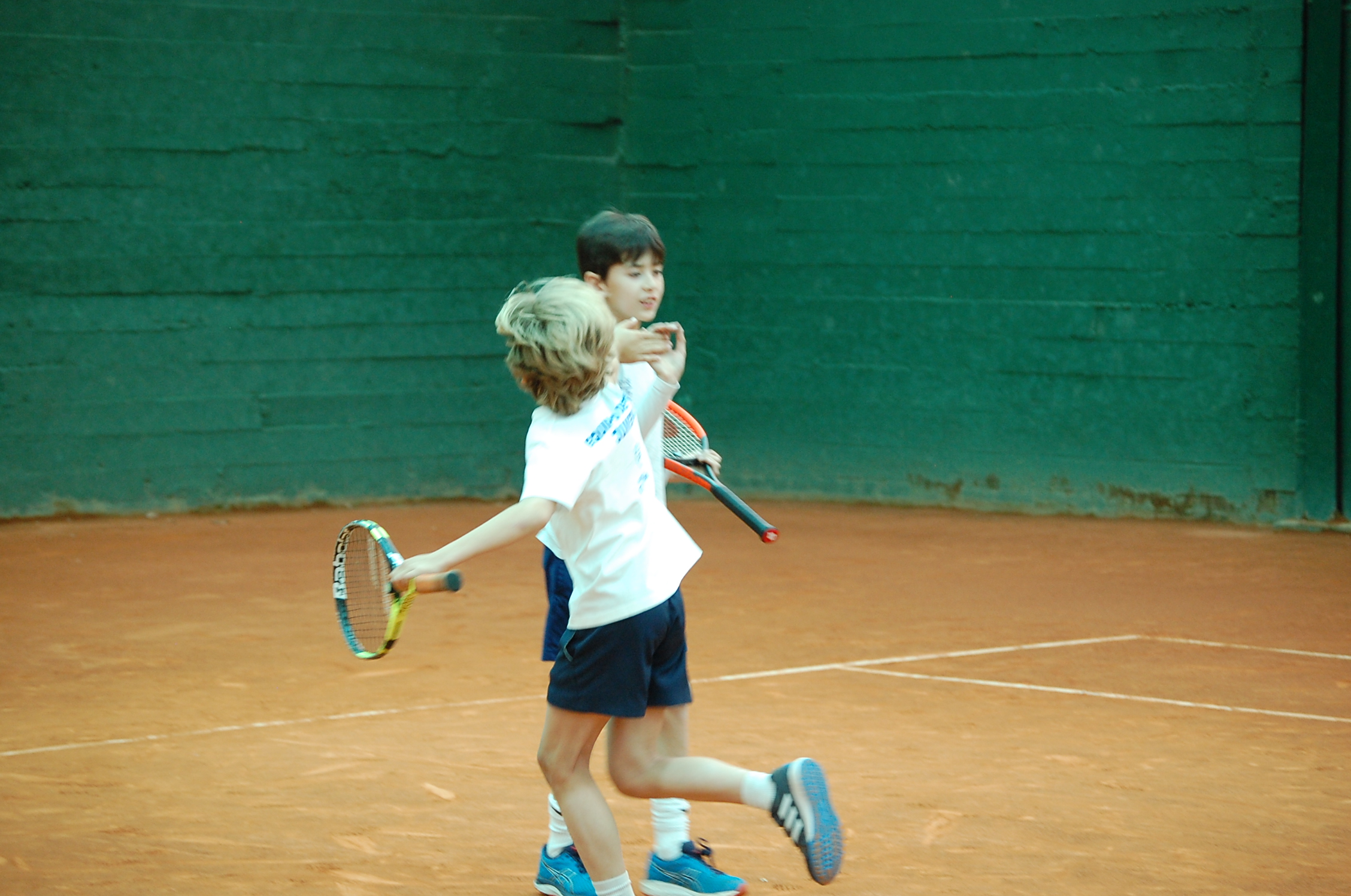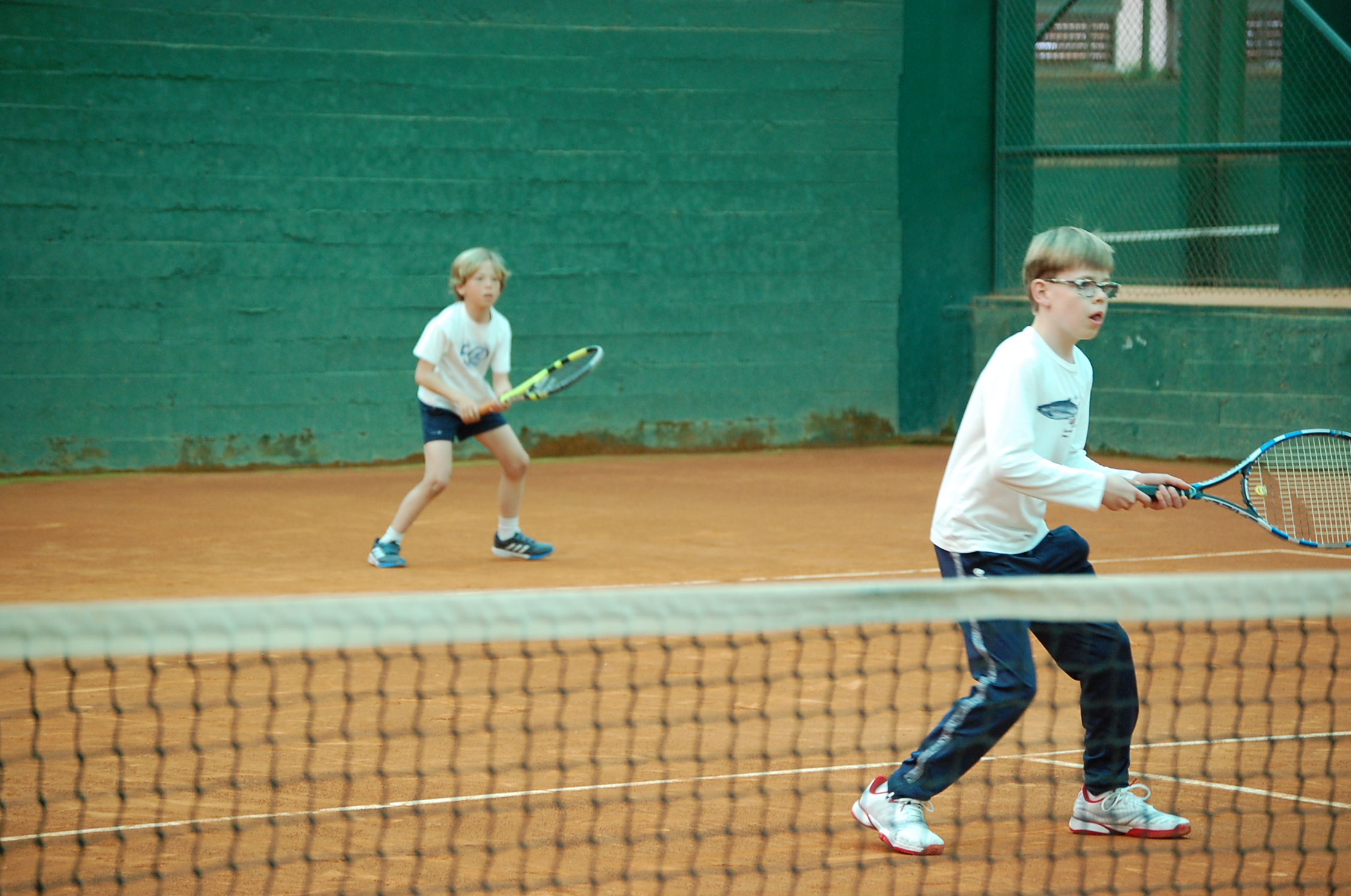 Como siempre la bienvenida y el calentamiento previos al inicio de la jornada. En esta ocasión la jornada estaba dedicada a la MODALIDAD DE DOBLES. El equipo de profesores ha explicado las diferencias de esta modalidad y ha realizado una demostración jugando unos puntos en los que los profesores han representado las distintas figuras que conforman la pareja de dobles: sacador, compañero del sacador, restador y compañero del restador. Han escenificado las formaciones más comunes en el juego de dobles con los dos jugadores en el fondo de pista, uno en la red y otro en el fondo. Durante los puntos han jugado en todas las posiciones llegando hasta la red para terminar el punto, dando así una idea de la belleza técnica y táctica que el doble nos permite.