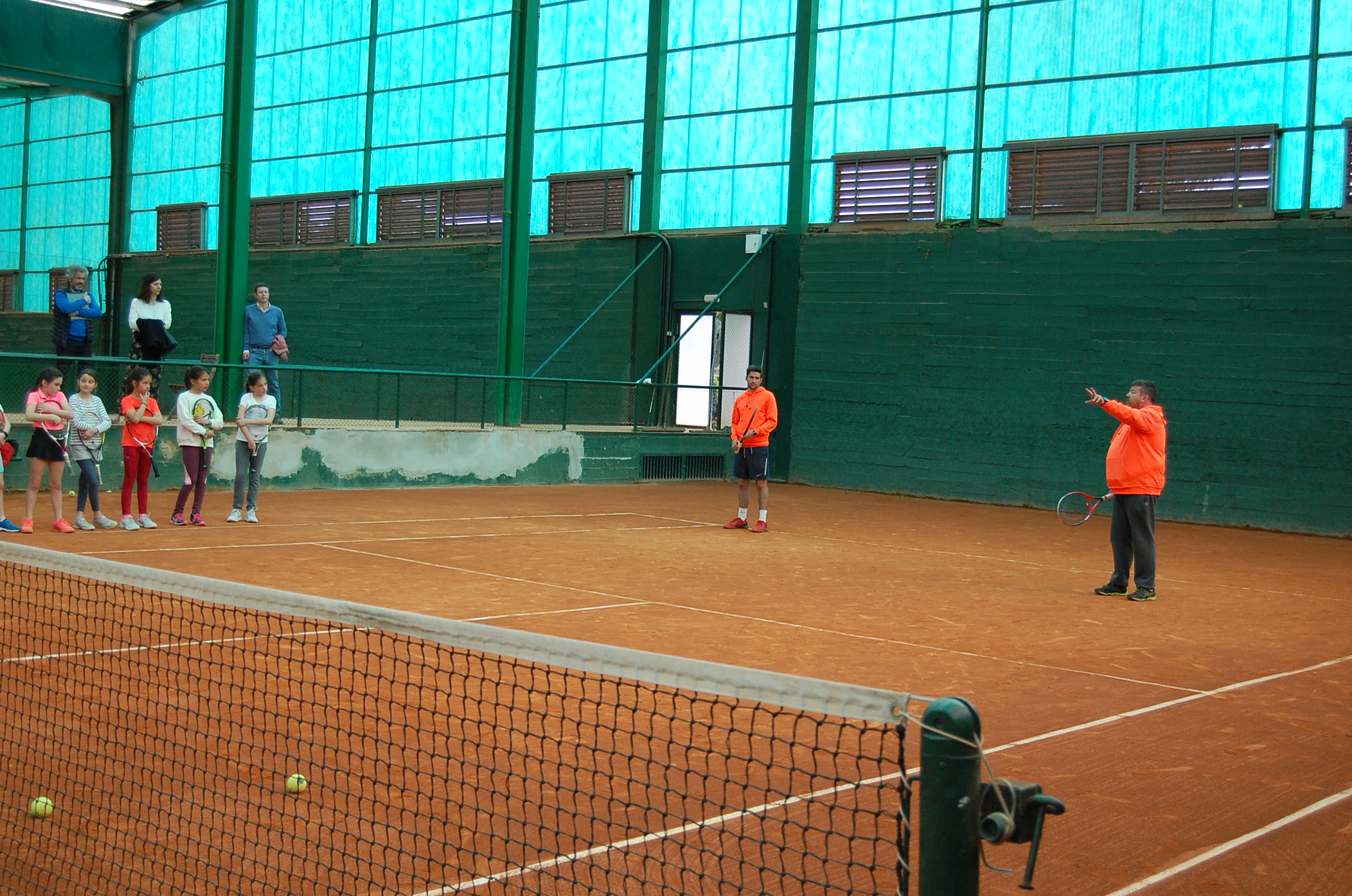 Como siempre la bienvenida y el calentamiento previos al inicio de la jornada. En esta ocasión la jornada estaba dedicada a la MODALIDAD DE DOBLES. El equipo de profesores ha explicado las diferencias de esta modalidad y ha realizado una demostración jugando unos puntos en los que los profesores han representado las distintas figuras que conforman la pareja de dobles: sacador, compañero del sacador, restador y compañero del restador. Han escenificado las formaciones más comunes el juego de dobles con los dos jugadores en el fondo de pista, uno en la red y otro en el fondo. Durante los puntos han jugado en todas las posiciones llegando hasta la red para terminar el punto, dando así una idea de la belleza técnica y táctica que el doble nos permite.